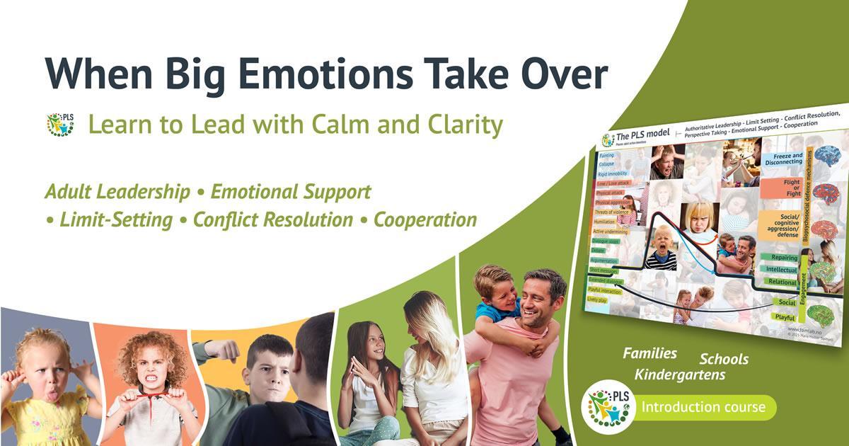 Banner for the “When Big Emotions Take Over” course, featuring the PLS (Positive Learning Social) framework. The image includes a bold headline, the tagline “Learn to Lead with Calm and Clarity,” and keywords such as tantrums, trauma, and aggression. There are sections highlighting adult leadership, emotional support, limit-setting, conflict resolution, and cooperation. The banner displays children and adults interacting, with a colorful background and a detailed PLS Model chart illustrating strategies for emotional regulation and conflict resolution. The bottom mentions families, schools, kindergartens, and an introduction course.